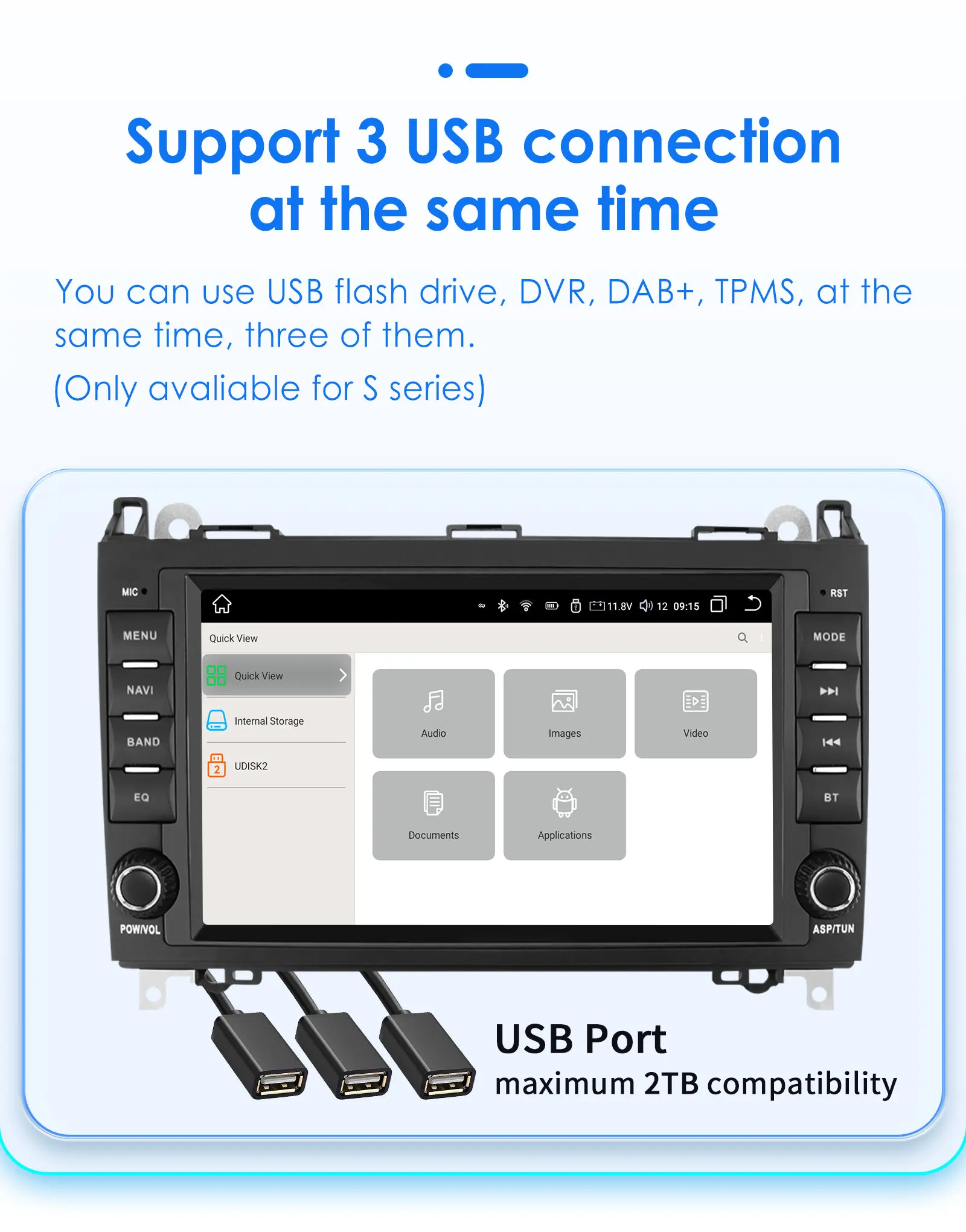You can use USB flash drive,DVR,DAB+TPMS at the same time,three of them.